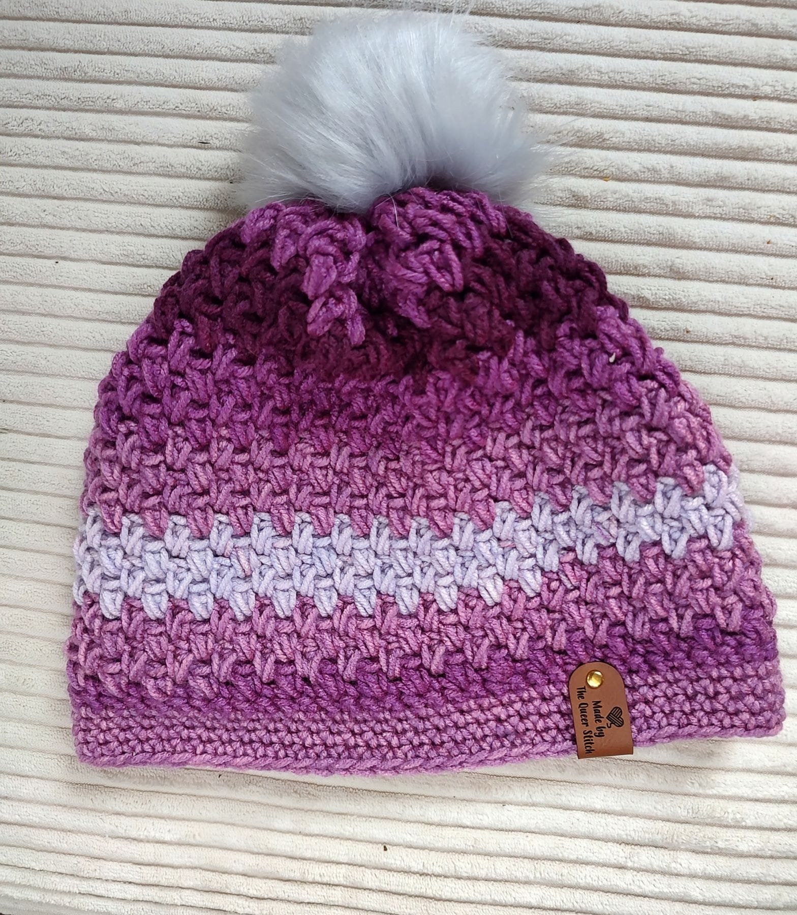 Beanie with pompom, shades of purple.